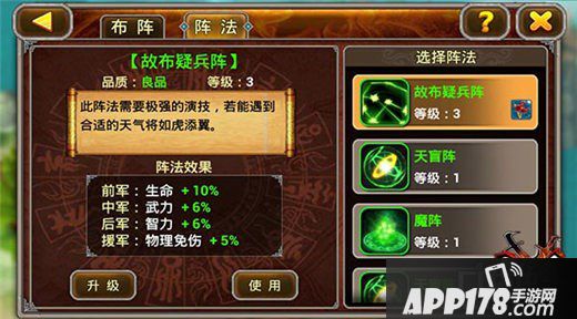 故布疑兵阵:对于初玩来说,故布疑兵阵是最易获得也最实用的阵法!前军加+10%的生命,堪比紫阵,再也不用担心肉盾血不够厚啦!中军+武力6%对于强力输出和弓箭型武将都是超级有用的!后军放奶妈和魔法输出,+6%的智力,提升整军实力毫无压力!援军肉盾或近战输入+5%的物理免伤让军队的最后一道屏障固若金汤!