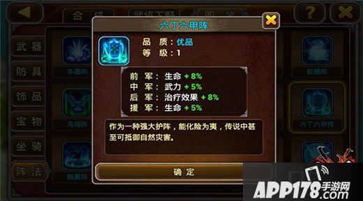 六丁六甲阵:可谓蓝阵中最稳健的阵法,出镜率极高,优势也很明显!前军加生命。中军加武力。后军加治疗效果。援军又是加生命。对于这样的超强阵法只需要配4个近战,一个治疗就可以了!玩的就是简单粗暴!