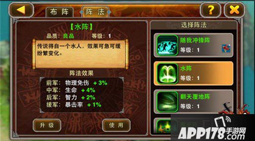 水阵:近战实力对于《X三国》来说真的灰常重要,水阵的前军物理免伤效果对于顶在最前方的肉盾来说是很好的属性,中军加生命也可以提高近战输出的生存能力,能够生存下来输出自然也就高了!后军的智力自然不用多说!援军加了暴击率,反败为胜的几率就大大提高了哦!