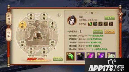 在经脉系统中,桃花玩家可使用回天珠更换英雄潜能属性的类型。英雄的进攻潜能要选择火攻击;防御潜能选择体力;斗志潜能选择命中;意志潜能选择身法;毅力潜能选择穿刺攻击。