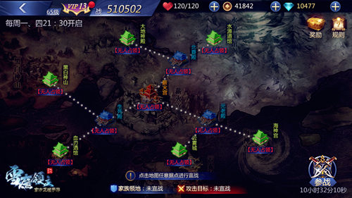 每周一和周四,《雪鹰领主》手游将开启“家族争霸”活动,家族长或副族长可以选择一处领地宣战。领地内有7座塔楼,占领塔楼时间最久的家族将成为该领地的拥有者。家族战中获得的稀有物品可在家族拍卖行拍卖,获得的金钱可作为分红,发放给参与战斗的成员。