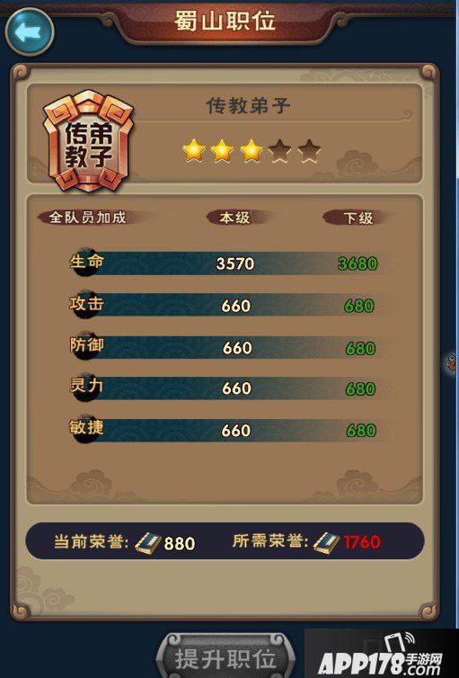 声望可以提升你在蜀山的地位,地位提升当然也有很高的属性加成。点击主角,就可以看到职位了。对于新手来说,提升的属性非常不错。