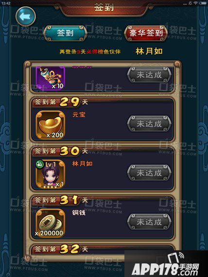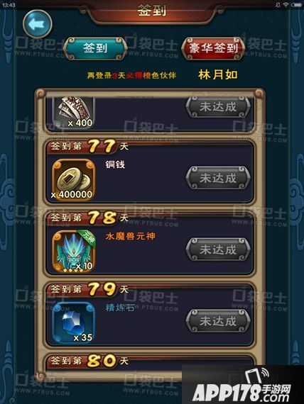 当玩家签到34天时,就可以取得+1的林月如,如果前期可以把留下的圣灵珠使用的话,这里可以直接升到+2,这样一来的战斗力就非常不错了。但是考虑林月如毕竟是一个需要大量氪金的橙卡,并且后期的泛用性也并不是很好,除了全敏速攻队以外很少使用。如果对卡牌本身并没有什么留恋的玩家可以考虑直接化炼掉林月如,并且用所得的高级信物来提升自己的国家队(签到还能获得水魔兽和黑磷王等,但是他们的价值还不如林月如,不要犹豫直接炼化掉)。