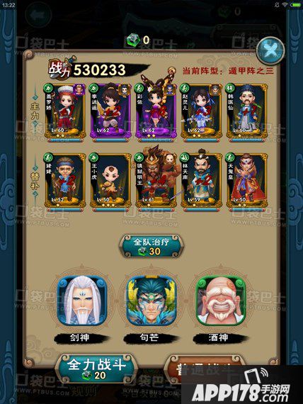首先就是阵容配置,其实相当简单。主角一奶三AOE即可,当然如果玩家能拥有李逍遥+小灵儿+李忆如+天鬼皇+盖罗娇的国家队配置当然就更加完美了。需要注意的是,没有李忆如的玩家可以和小编一样用韩医仙来代替,效果并不差很多。小灵儿的作用主要是控场,只要冻住地方主力伤害就可以把伤害减到最小,而天鬼和盖罗娇的作用当然就是打输出了,可以替换的还有姬三娘、林南天等。