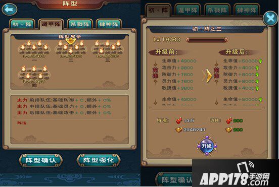 另外阵型方面开放等级养成,使用对应阵法,随着该阵法等级的提升,属性也会得到增强,阵法养成需要消耗战气,只有达到指定等级才会消耗元宝,满级为60级。