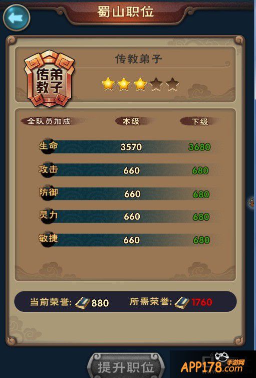 声望可以提升你在蜀山的地位,地位提升当然也有很高的属性加成。点击主角,就可以看到职位了。对于新手来说,提升的属性非常不错。