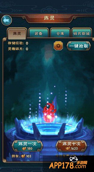 每天可免费炼灵一次,单次炼灵180元宝,炼灵十次1620元宝。一键拾取会自动把经验之灵转化为经验,其它炼灵自动放入仓库界面,每次炼灵会获得一个灵魄碎片,可在碎片商城换取需要的灵魄。