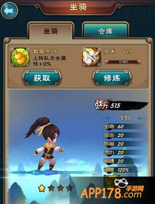 初始赠送的坐骑是一把飞剑,技能可以给上阵队友带来全属性+2%的加成,同时坐骑的属性统一会附加在所有队员上。