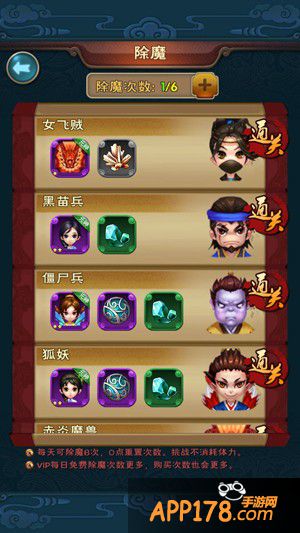 在副本界面的上方进入除魔玩法,每天可挑战6次,0点重置次数,挑战不消耗体力。VIP玩家每日免费除魔的次数更多,购买次数也更多。