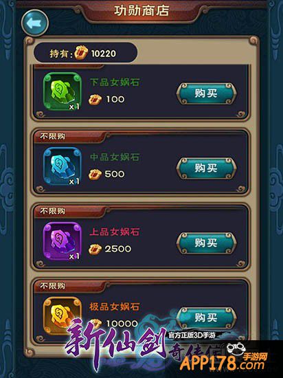 当玩家和御灵都满足一定的等级条件后,还可以对御灵进行进化。进化后的御灵对于属性加成和技能伤害都有大幅度的提升,御灵自身等级上限也随之提高。进化所需要的必需品“女娲石”也分为下品、中品、上品和极品,分别对应了御灵进化的四个品阶。女娲石可以通过每日成就、副本、商城来获得。当然,最简单的还是鼓励玩家参加竞技场的擂台赛,用功勋点在功勋商店中换取女娲石。