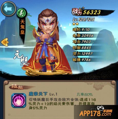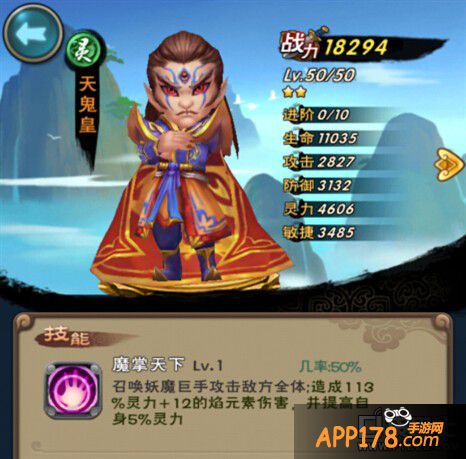 魔掌天下:召唤妖魔巨手攻击敌方全体;造成灵力百分比+12的焰元素伤害,并提高自身5%灵力。由图可见,随着英雄进阶,伤害计算中的灵力百分比会提高,其他不变。