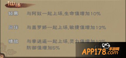 仙缘点评:与盖罗娇同时出场可以增加自身的敏捷,盖罗娇也是玩家必备的卡牌之一,这里不多做介绍。与李逍遥的仙缘增加了自身的抗性。阿奴是四星橙卡,获得难度比较高,视玩家情况而取舍。