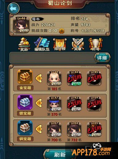 而蜀山论剑则是一个挑战平台,全服都有一定的名次,我们可以去选择人物进行挑战,挑战之后会获得积分以及奖励。挑战人物分为三个阶段,金宝箱、银宝箱,和铜宝箱。其中里面都有铜钱以及声望。