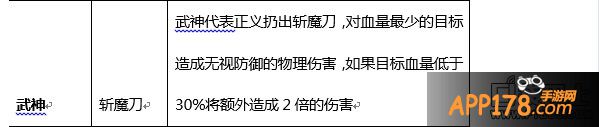 斩魔刀:武神代表正义扔出斩魔刀,对血量最少的目标造成无视防御的物理伤害,如果目标血量低于30%将额外造成2倍的伤害。