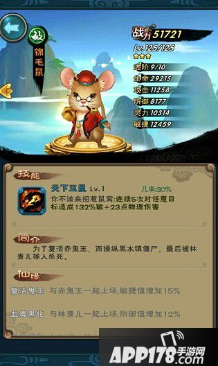 锦毛鼠是配合新版本仙剑前传的剧情放出的全新原创角色,技能是【天下五鼠】,可以连续5次攻击对任意目标造成125%敏+23点物理伤害。虽然锦毛鼠的加入会让玩家觉得有些突兀,不过不得不说这张卡牌还是比较强力的,可以把它理解为简化版的南蛮王来培养,想培养强力单体攻击的玩家可千万不要错过。
