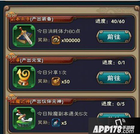 现在你每完成一个日常任务可以的到5点积分,当积分达到一定数值后就会得到元宝奖励。