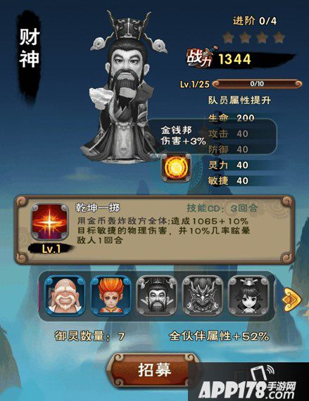 财神。财神有十分看脸的控制技能(这个几率值得吐槽。巫后也是20的几率但是实际触发效果真的很高)以及所有人物的伤害增加,这属于一个全能性的人物,不过是需要元宝开,大家尽力而为把!