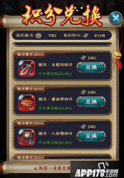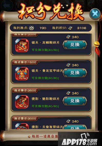 通过对比我们会发现不同红装部件重要程度不同购买碎片时需要的胜点是不一样的:破天和捷影最重要的部件分别为武器和鞋子。所以需求最高胜点3500点。而其他的依次减少500点胜点要求。但所需积分都是240/个。同时积分还能兑换鼠儿果和经验丹及虫子,但是这些东西并没有什么太多鸟用。