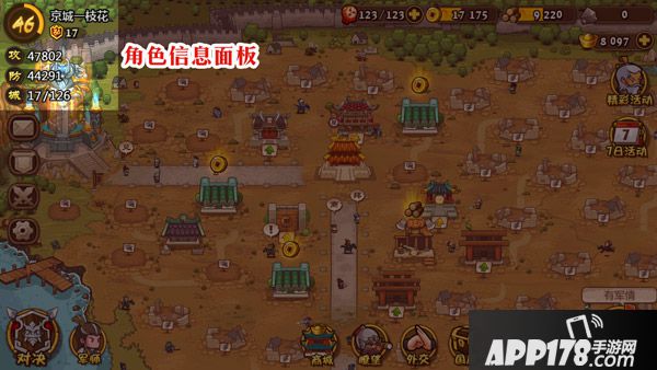 左上角是“主公”的个人信息,包括等级、经验条、攻防战力值等。