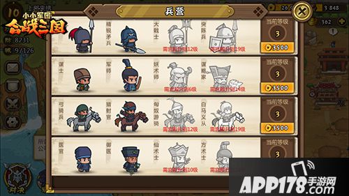 《小小军团合战三国》里一共有八个基础兵种,按攻击距离分为近战和远程。近战兵种有步兵、骑兵、盾兵、矛兵,远程兵种有弓兵、谋士、弓骑兵和医官,除医官外均为伤害单位,医官为治疗单位。每个兵种有三个进阶兵种,当宫殿达到一定等级后解锁。