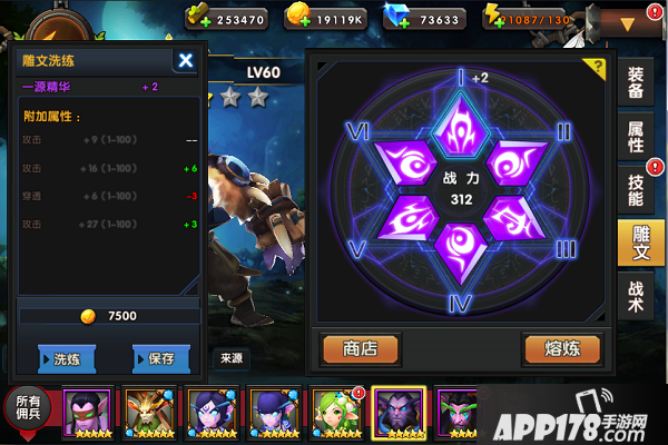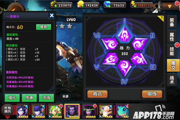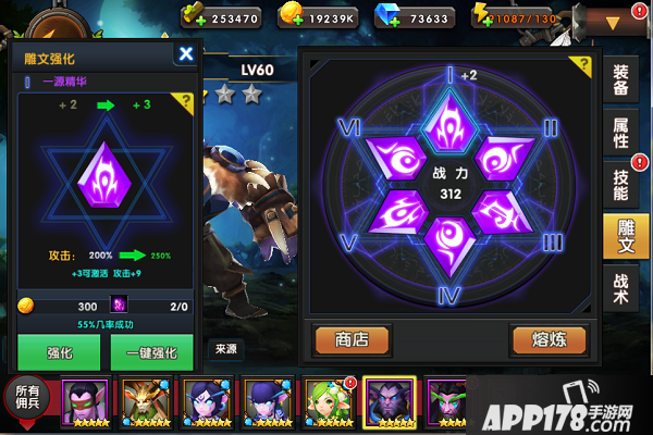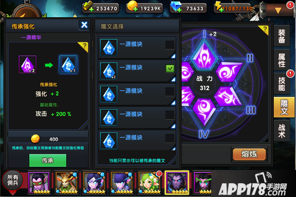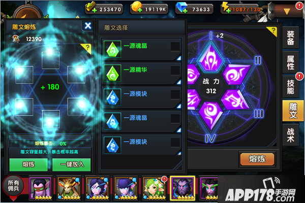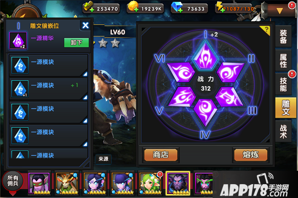 当玩家的领主等级达到25级,将会开启“雕文”系统,雕文是提升英雄属性的主要道具。通过“佣兵”打开英雄面板,我们可以进入“雕文”选项,在界面中我们看到整个雕文系统包括镶嵌位、属性面板、功能按钮三个部分。