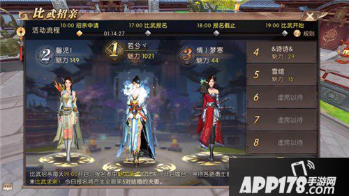 比武招亲的具体玩法,需要女方使用道具——玫瑰,前往轩辕城的红娘处报名。每日魅力第一的玩家可开启擂台,等待有缘者前来迎娶自己。想要抱得美人归的男玩家也需要使用道具玫瑰提前报名,名列前十的天命者才有资格打擂,为红颜而战。