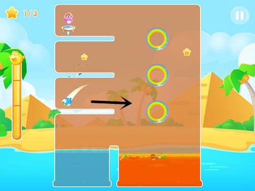 本关可以说是上一关的加强版,有三个转动的彩虹圈圈,玩家需借助这三个彩虹才能收集到星星,同时也是需要对该道具有一定的熟练度,否则本关很容易掉落到右下角的鱼锅中。本关要到达终点其实并不难,但要收集到三颗星就有点难度。左侧的两颗星都位于两个凹坑之内,右侧的星星则会上下移动,也不利于收集。