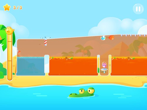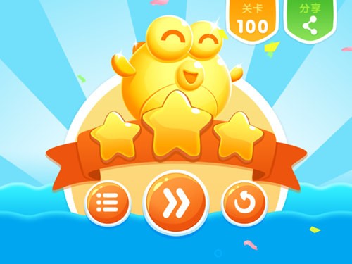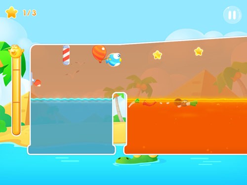首先,先直接收集到最左侧的第一颗星星,接下来就要考虑如何收集另外两颗星星并到达终点。跳入到泡泡气球中并不会让气球移动,所以还是需要靠外力来推动,此时左侧的机关门就要运用到。先打开红色的机关阀门,然后机关门就会向右侧移动,此时需将小鱼弹入到泡泡中,机关门会开始推动气泡向右侧移动。随着气球的移动就会自动收集到另外两颗星星,等到达目标处时再点破泡泡掉入即可。