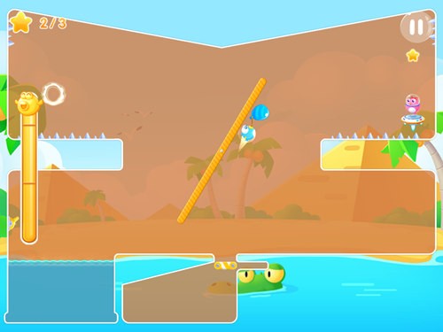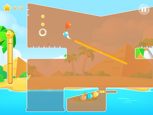 虽然本关的地形并不宽广,但也设下了不少障碍和陷阱。首先正中间有一根转动的长木棍,这根木棍的作用在于带动气球飘向不同的方向。最下方的三颗气球需要打开机关阀门才能飘出,可以通过水池上方的阀门进行控制。地形上面左侧有两颗星星,但周边都会有冰刺,在飘动气球时需注意。另外一侧则是终点,同样需要控制好降落的位置。