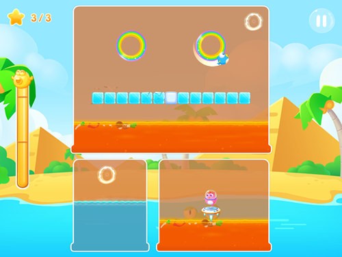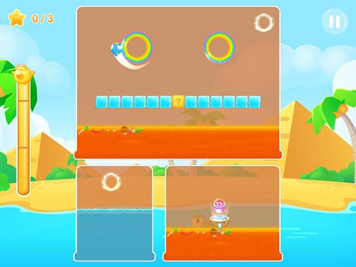 本关的布局其实很简单,可分为起点、收集点以及终点。而游戏的重点也就是在于收集区域,在收集区域中,底下是滚烫的鱼锅,而小鱼就需要在这鱼锅上方开始收集星星并冲向终点处。鱼锅上方由一排冰块,可以用来反弹小鱼,冰块的中间位置有一个问号格子,三个星星都藏于此处,需要让小鱼碰触三次方能完成收集。而本关的主要借助设施则是彩虹圈圈,两个彩虹圈圈将用来控制小鱼来收集星星。