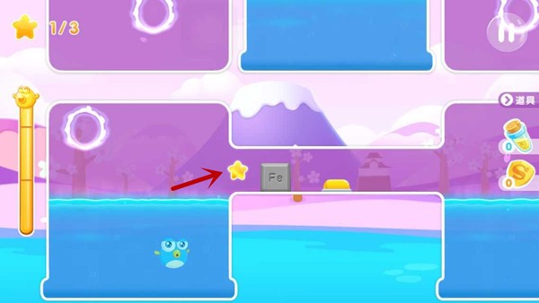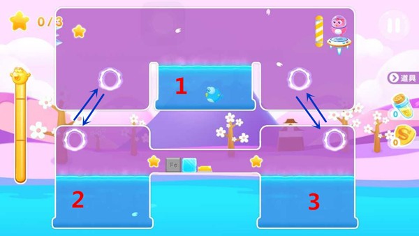 1.很多朋友会尝试先收集左上角的星星,但往往容易被钉刺碰到而死亡;小编建议大家先从1号水池传送到3号水池中,右下方的这颗星星很容易就能收集到,同时飞飞多跳跃几次打破里面的冰块道具。注意不要用冲刺以免铁块掉入水中,铁块在后面有重大作用。