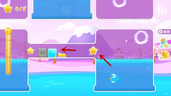 3.铁块将按钮压住后,黄色挡板会移到最左边并挡住钉刺;第三颗星星也可以快速收集到了。