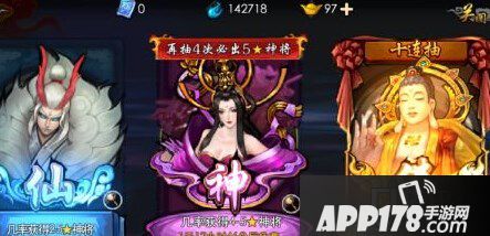 可消耗2468元宝进行抽取;几率或者4-5星神将。每次必获得5星神将或神将碎片。(土豪请劲情的抽取