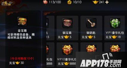 用元宝购买各种VIP豪华礼包、宝箱、钥匙、精力、体力、灵力。(元宝充值或完成任务获得)