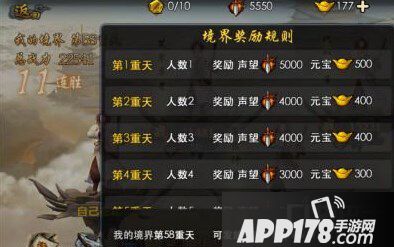 每天有10点体力,挑战完后每30分钟恢复1点体力、或者用元宝补充体力。挑战多少重天,战斗胜利则提升重天,战斗失败无变化,战斗无论结果怎样都可以获得声望奖励。