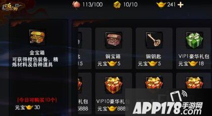 用元宝购买各种VIP豪华礼包、宝箱、钥匙、精力、体力、灵力。(元宝充值或完成任务获得)