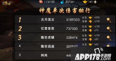 该排名每天重置,当天单次对神魔造成伤害最高的前50位玩家会进入排行榜,排行榜每日结算会发放大量元宝及宝卷奖励。