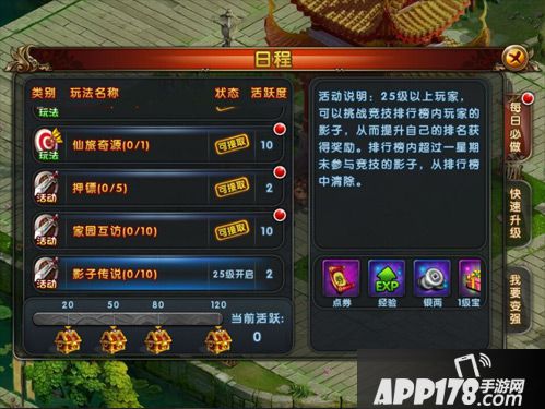 奖励:经验、银两、点券、一级宝石袋、活跃度