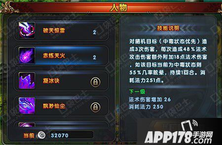 对随机目标(中毒状态优先)造成3次伤害,每次造成48%法术攻击伤害额外附加固定法术伤害(伤害随技能等级提升)如该目标当前为中毒状态,则55%几率眩晕,持续一会合,消耗法力250点。前期性价比不如破天,等级高了以后性价比很高,伤害爆表,还有就是耗蓝有点多。