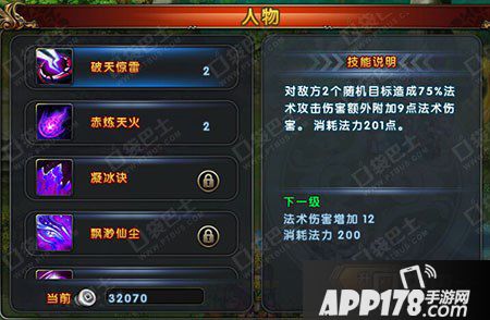 对敌方2个随机目标造成75%的法术攻击伤害,额外附加固定法术伤害(伤害随技能等级提升),消耗法力200点。(技能15级攻击3个目标,26级攻击4个目标)