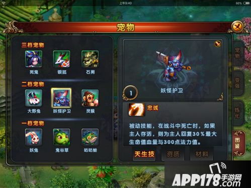 忠诚,被动技能,在战斗中死亡时,如果主人存活,则为主人恢复30%最大生命值血量与300点魔法值。