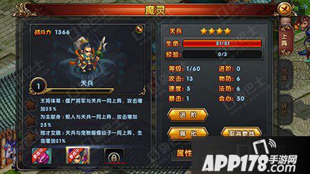 根据上图我们看出1级的天兵,其战斗力就有1366,最大等级60级。并且还是4星的魔灵哦,应该是很不错的。并且与各大宠物搭配追加的属性就很逆天啊, 小编建议长期培养这个魔灵哦。