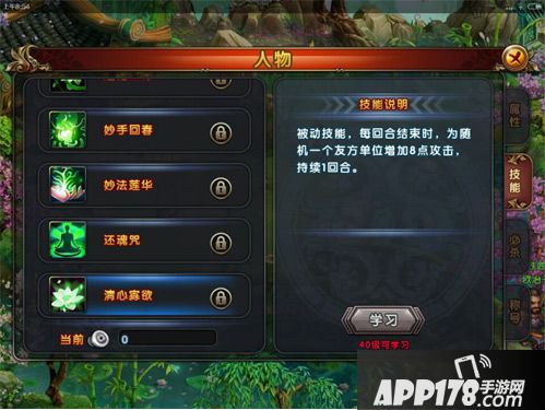 清心寡欲(40级可学):被动技能,每回合结束时,为随机一个队友增加8点攻击,持续1回合。