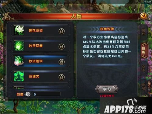 妙法莲华(20级可学):对一个敌方生命最高目标造成130%法术攻击伤害额外附加法术伤害,额外伤害随技能等级提升而提升,有33%几率使目标所受伤害回复给除自己外的一个队友。消耗法力150点。