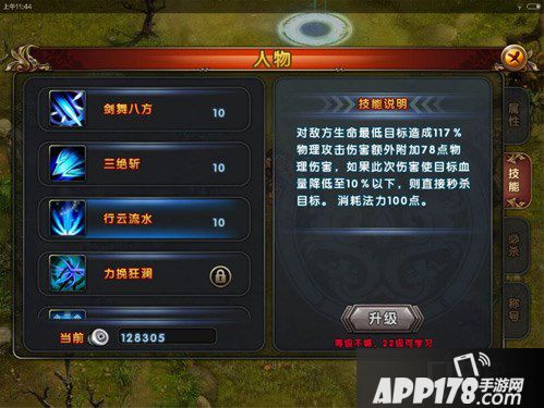 行云流水,对敌方生命最低目标造成117%物理攻击伤害额外附加物理伤害,如果此次伤害使目标血量降低至10%以下,则直接秒杀目标。消耗法力100点,额外伤害随技能等级增加而增加。