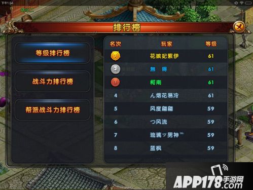 排行榜分为了等级排行榜、战斗力排行榜、帮派排行榜三个。目前,等级和战斗力都选择了前50名玩家,而帮派只能看到前35位。
