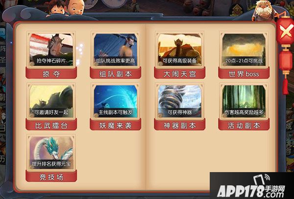 点击副本即可直接进入任务剧情副本;点击日常可以看到日常完成的任务,进入后日常界面后,点击对应的任务即可快速开启该任务;点击历练入口,直接开启历练副本,历练里面的玩法掠夺、组队副本、大脑天宫、世界boss、比武擂台、妖魔来袭、神器副本、活动副本、竞技场。