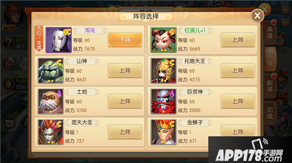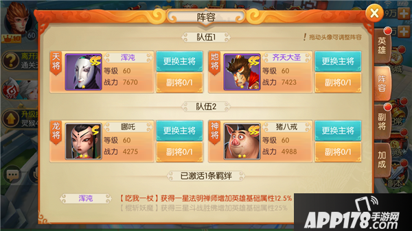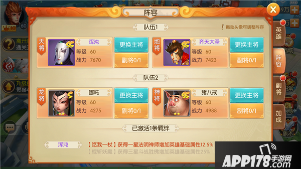 主将:上阵主将位置的英雄可以携带到战斗中,共计天、地、龙、神四个主将位,玩家可以在阵容界面随意调整位置。
