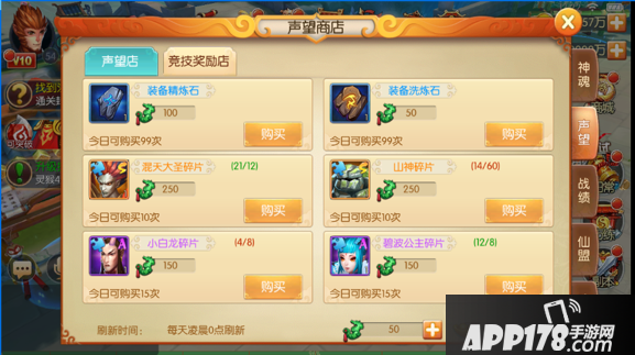 商店:声望商店买混天大圣,战绩商店换红孩儿,仙盟商店换地藏王,功勋商店买牛魔王,逐渐养成。