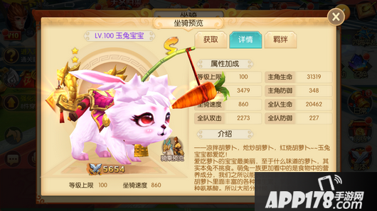 坐骑除了能升级以外,自然也可以进阶升星。进阶之后的坐骑外观,可是能有明显的变化!7星的玉兔宝宝,比起1星的玉兔宝宝整体来说可是霸气了不少,配合可以乘坐的背饰,简直就是仙家坐骑的典范。